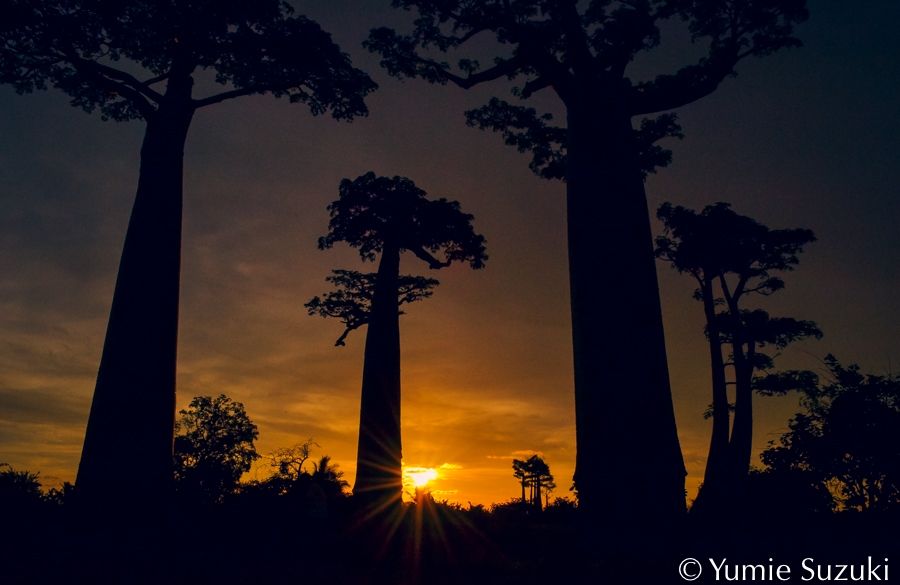 夕方、バオバブの並木道にて美しい夕日に照らされた幻想的なバオバブの姿を鑑賞します。