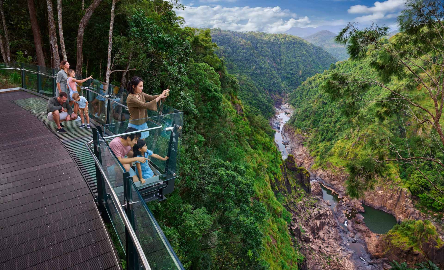 手つかずの熱帯雨林の木々の最上部で枝葉が連なるほんの数メートル上を滑るように進み、レッドピークやバロンフォールズでは熱帯雨林の地面近くの林へ降りて探索することができます。