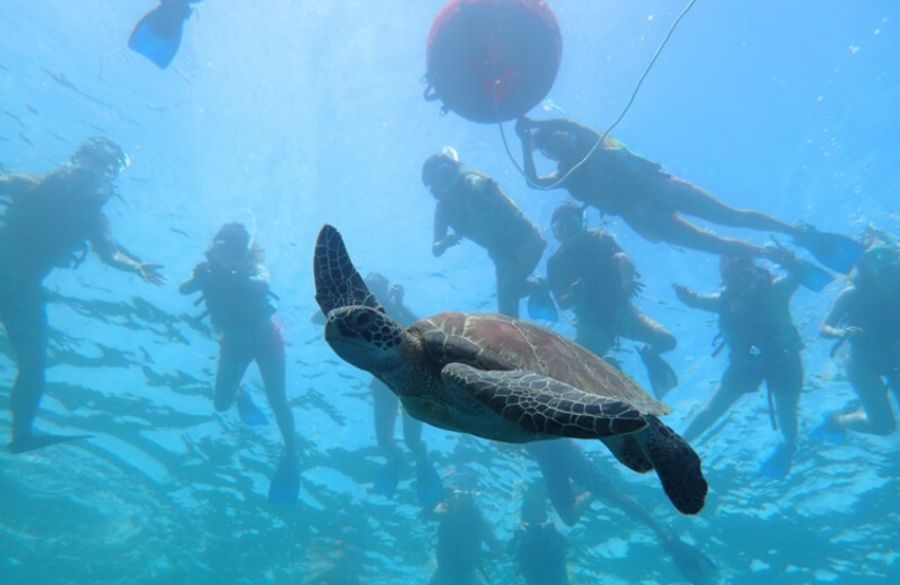 ボートから行うシュノーケルは初心者でも簡単!秘密のウミガメポイントでは、多くのウミガメが見れる事も。