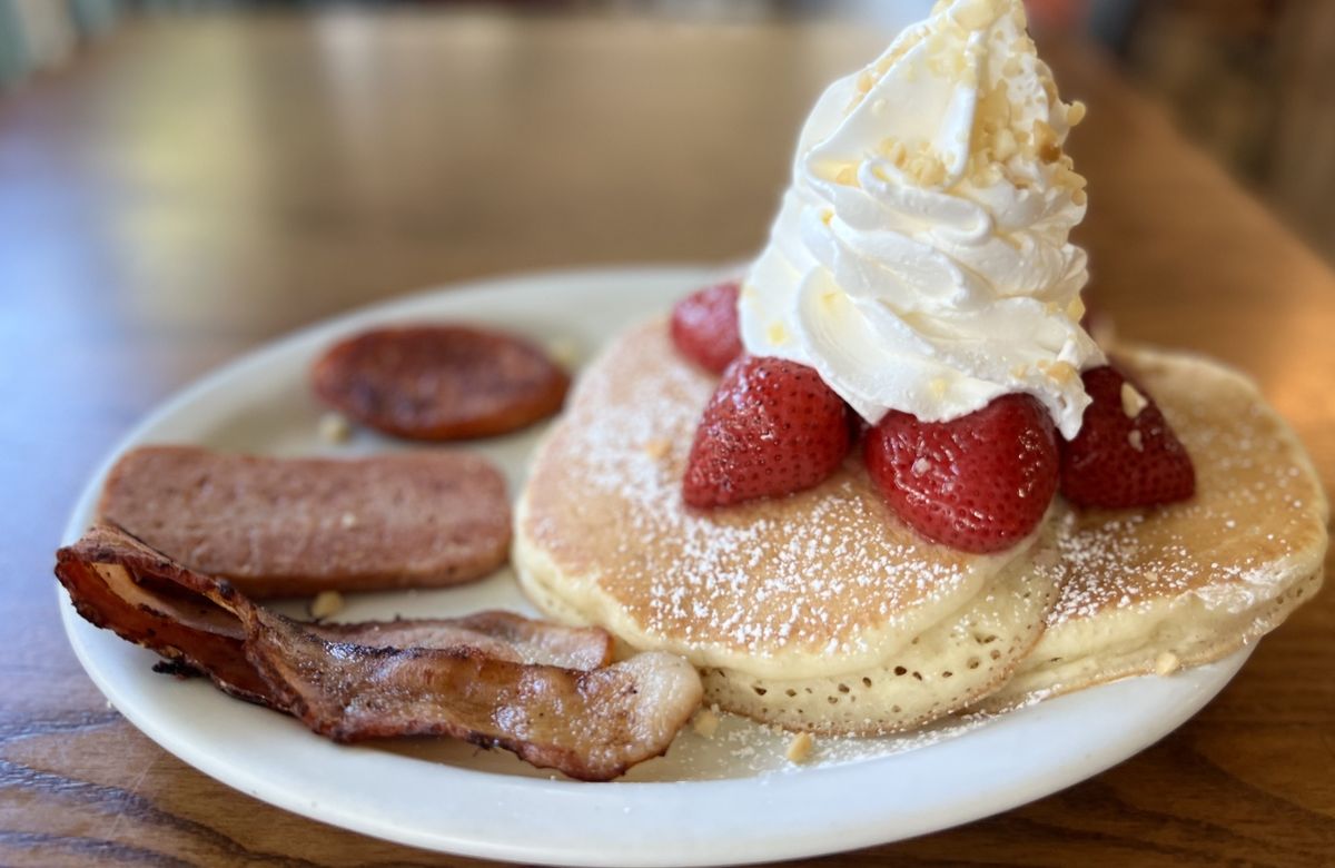 【朝食内容】ストロベリー・ホイップ パンケーキ3枚とポルチギーズ・ソーセージ&スパム&ベーコン各1切れのセットまたはロコモコ(Locomoco)、コーヒーまたは紅茶(お子様はソーダに変更も可)