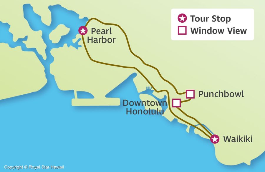 ロイヤルスター社のデラックスバスで行く5時間の“必見”デラックスツアーでは、第2次世界大戦武勲記念史跡を含むオアフ島の歴史的ランドマークを訪れます。
