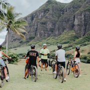 オフロード用の電動アシスト付きマウンテンバイクで、雄大なクアロアの大自然の中を巡るエコフレンドリーなツアーです。人気の映画ロケ地など4〜5箇所で停車しながら自転車で周ります。バスで行くのとは一味違って、自分の足で自然と風を感じることのできるツアーです。どのレベルの方にも安心して楽しんでいただけます。