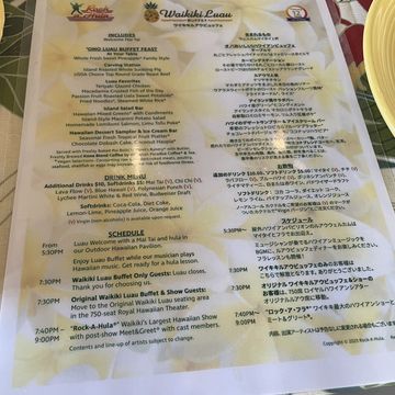 ロイヤルハワイアンセンターの近くに宿泊したいたため、本場のハワイアンダンスを間近で見たくて予約をお願いしました。パフォーマーも陽気なハワイアンばかりで見ていても楽しかったですし、ファイヤーダンスも迫力あって見ていてドキドキしました。ビュッフェスタイルの料理もハワイらしくシーフードもあれば姿焼きの肉料理もあって、ハワイらしいダイナミックなものが多かったです。ケーキがアメリカらしい激甘の味付けですごく美味しかったです(笑)