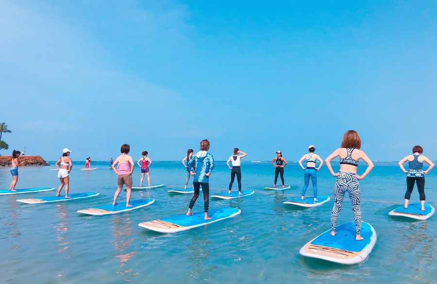 “ハワイのブルースカイの空の下で行われるサップヨガクラス”