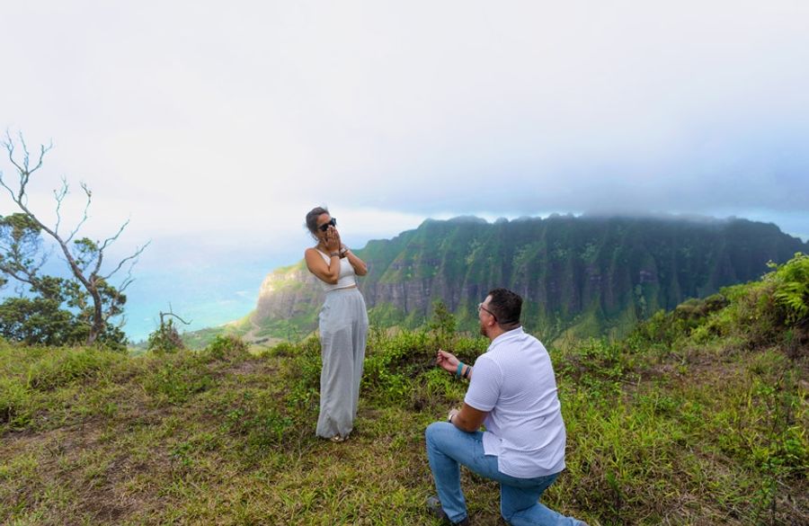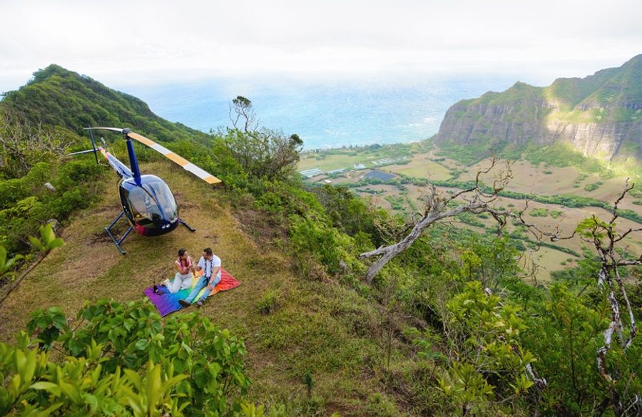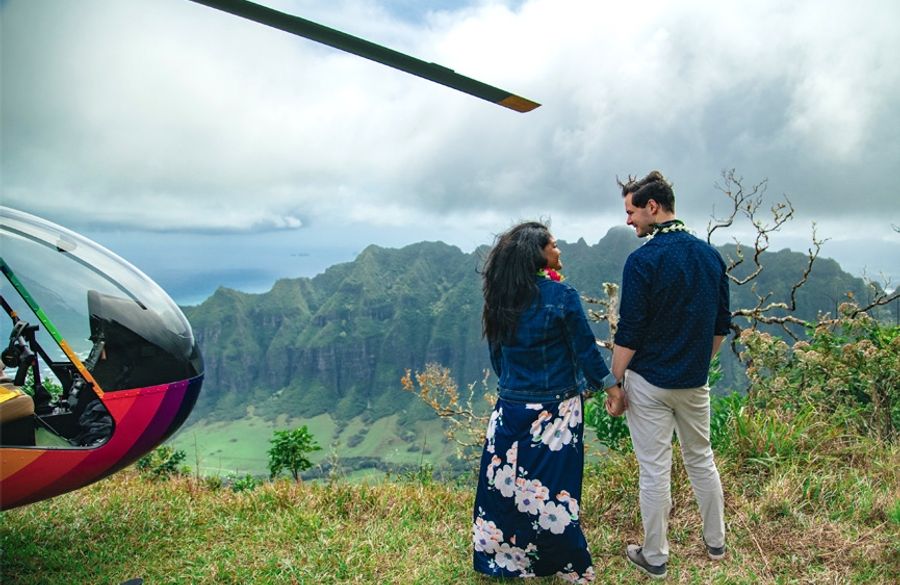 Wow your significant other with an unforgettable, one-of-a-kind private helicopter charter that includes an exclusive landing, on top of the North Wall of Kualoa Ranch called "Epic". This private, 4000-acre paradise will blow you away with its lush, green landscapes, mountains that reach to the clouds and gentle trade winds that stretch from the nearby windward coast. The proposal helicopter tour is an experience fairy tales are made of.