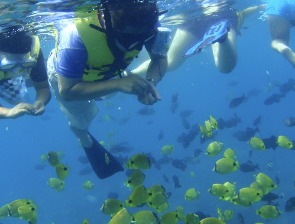 その後はシュノーケルポイントへ移動して、太陽の光と海の深い青い色の中、色とりどりのトロピカルフィッシュと一緒に泳ぎます。