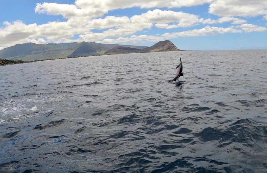 オアフ島でもっともきれいなワイアナエ沖の海には、朝になると体を休めるためにハワイアンハシナガイルカ達が集まってきます。