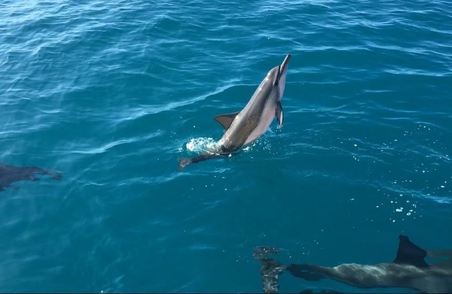 イルカを見つけたらボートの上から可愛い姿を眺めます。ボートと並走して泳いでくれることも! シャッターチャンスをお見逃しなく!