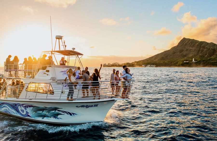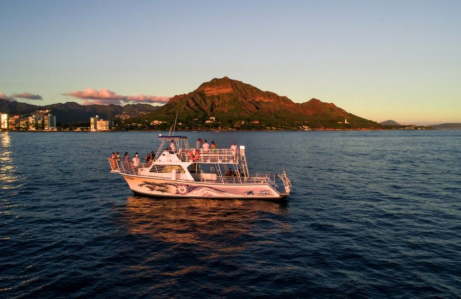 クルーズ船には船首と2階デッキがあり、船上から眺めるダイアモンドヘッド、サンセットや夜景は格別です。金曜日には船上の特等席から花火もお楽しみいただけます。サウンドシステム、デザイン照明完備のボートで、ライブDJの音楽と一緒にノリノリでダンスも♪
