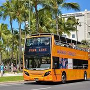 オレンジ色の二階建てバス(ダブルデッカー)。2階席からは、ワイキキのビーチや、オーシャンビューがお楽しみいただけます。 ブルーライン、レッドライン(一部)、ピンクライン(一部)でダブルデッカーをお楽しみください。