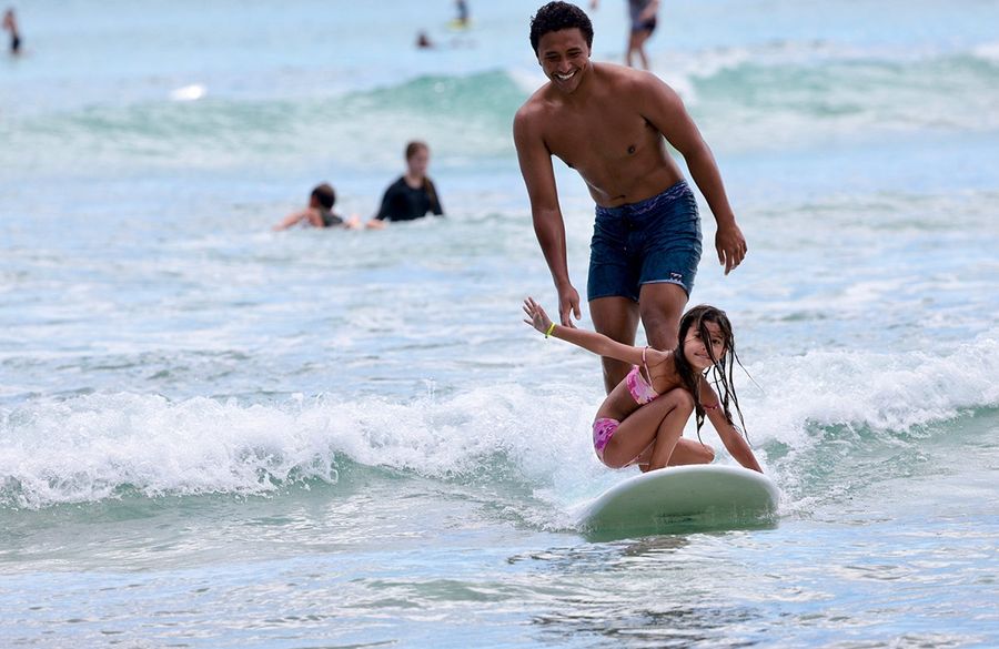 周りを山に囲まれたワイキキビーチは年間を通して穏やかで、波も小さくゆっくりと崩れるので初心者に最適です。小さなお子さまであれば波打ち際でサーフィン体験も可能です。