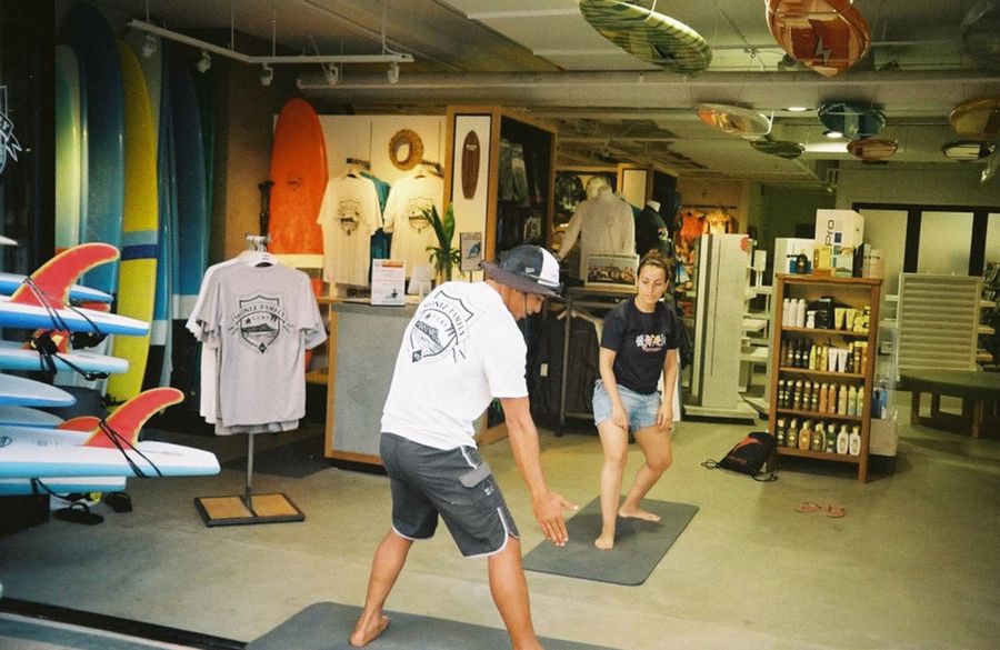 当日はハイヤット・リージェンシー・ワイキキホテルのダイヤモンドヘッド側、ビラボンショップ内にあるMONIZ FAMILY SURFで受付いたします。簡単なテイクオフや注意点を説明するブリーフィングを行った後、サーフボードを持ってワイキキビーチでサーフィンレッスンを行います。