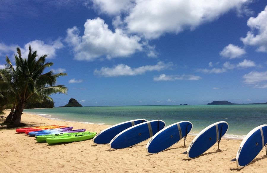 美しい砂浜が広がるビーチは波が穏やかなので、小さなお子様にも安心して海水浴が楽しめます。カヤック、カヌー、SUP (スタンドアップ パドル)、ビーチバレー、卓球などの設備も整い、各種アクティビティを存分にお楽しみいただけます。椰子の木陰にはハンモックがたくさん設置され、ワイキキの喧騒から離れ、自然の雰囲気の中でのんびりとお過ごしいただけます。