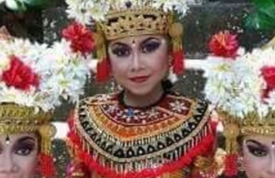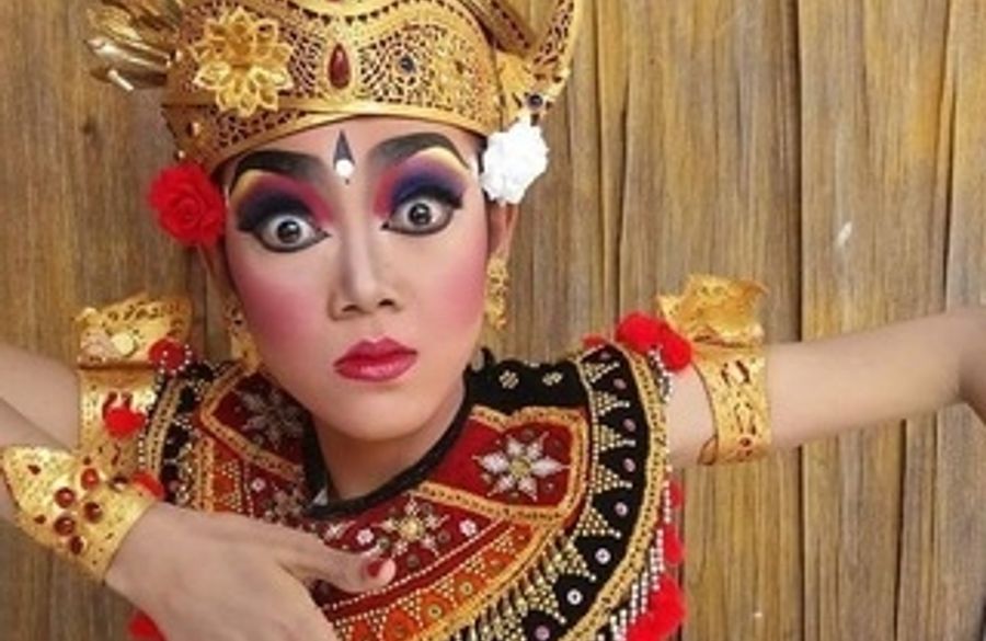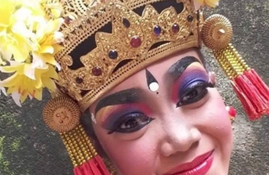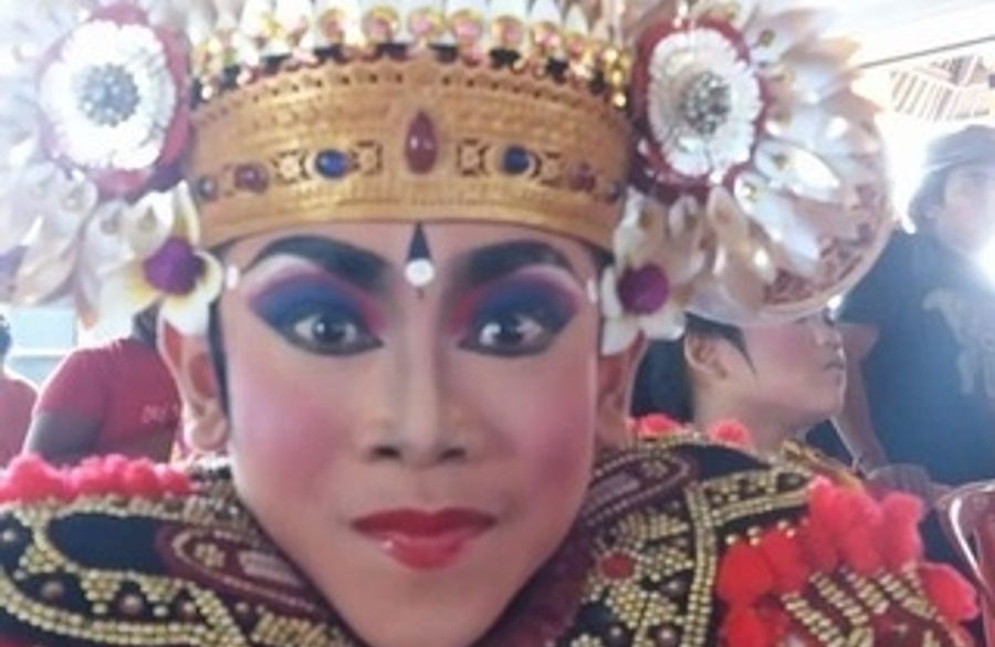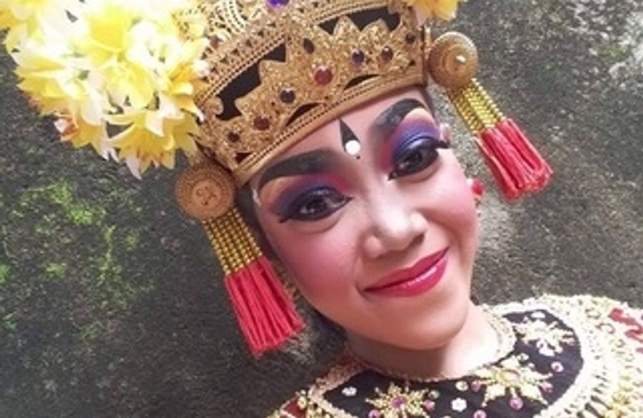 バリ舞踊の衣装を着て、本格的メイクもバッチリ。
