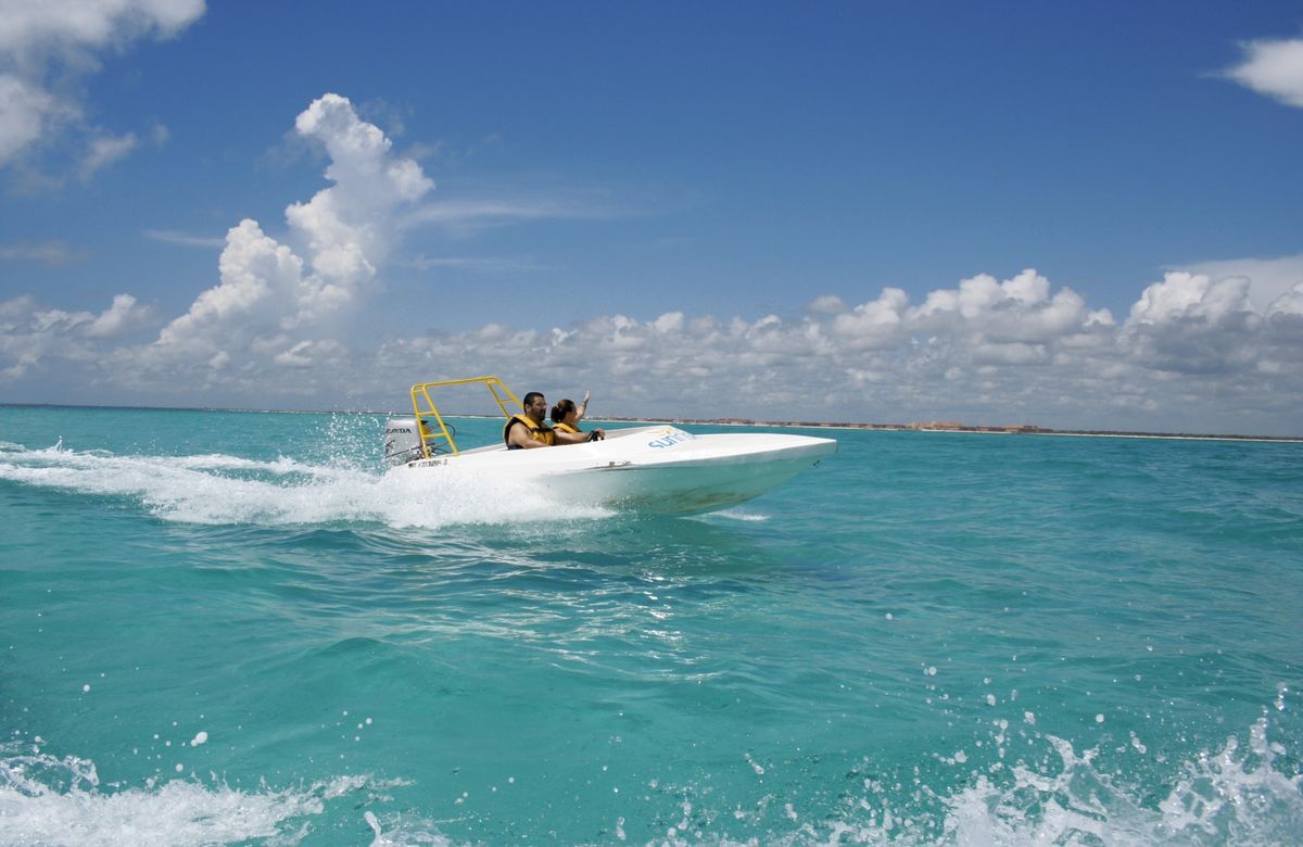 モーターのついた小型ボートを、ラグーンからカリブ海まで爽快に運転!