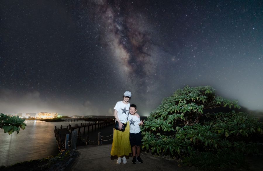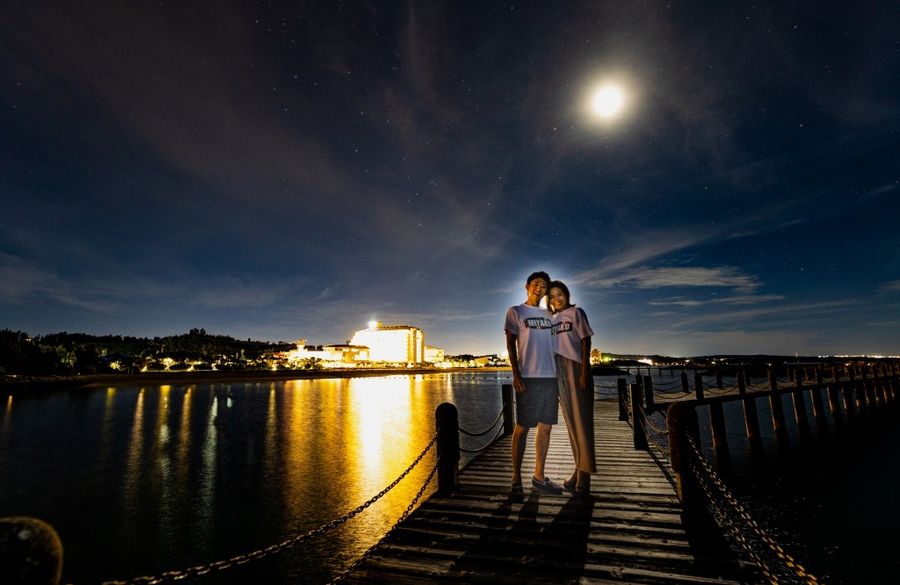 美しい海に囲まれた海上遊歩道で星や宇宙の解説に星空カメラマンが参加者を撮影するので自分なりのポージングをモデルのようにするもよし思い出の記念フォトを自慢するもよしカップル、夫婦、家族、友達で参加頂き星や宙の解説をしながら楽しく撮影します☆彡