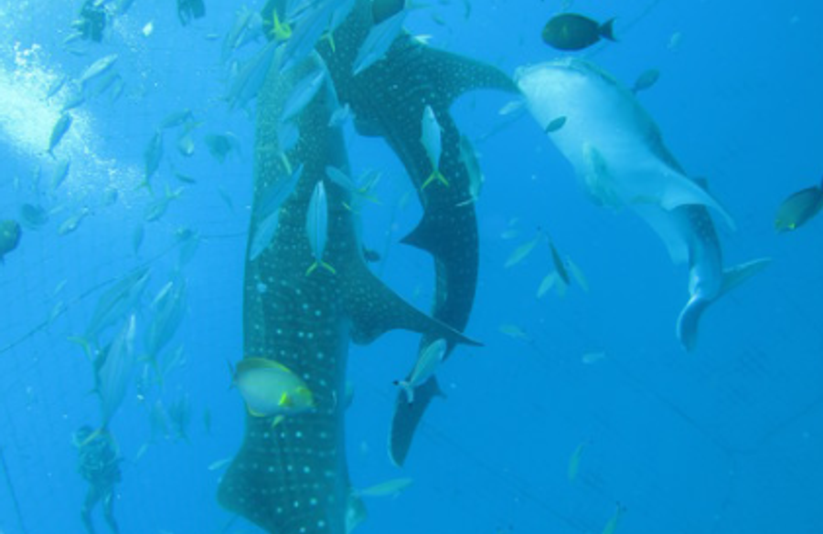 この網の中に入りジンベエザメに触れられるくらいの距離でジンベエザメの餌付けを見ることが出来ます。