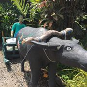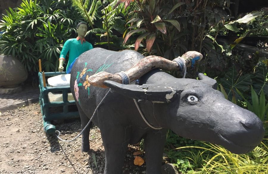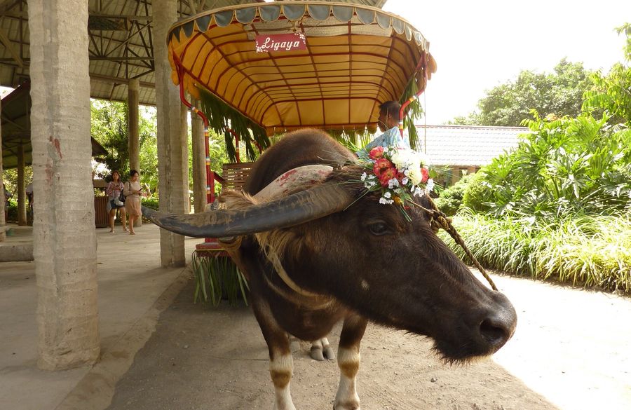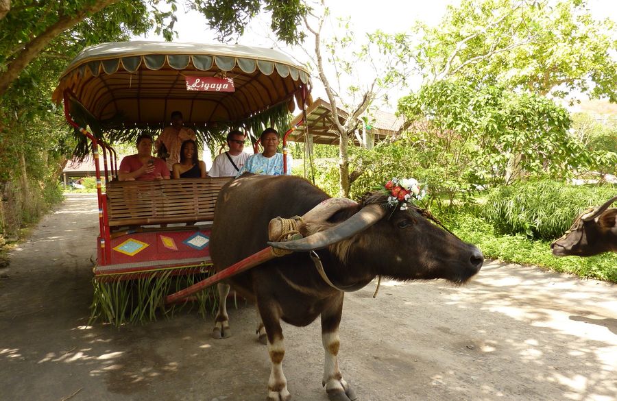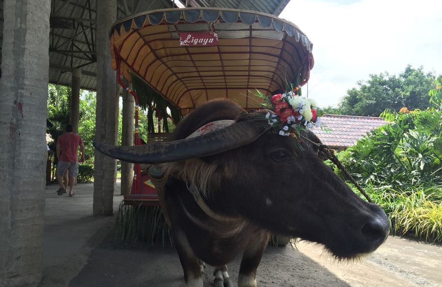 マニラ市内から約1時間半走り、南部の観光地ヴィラエスクデロへ到着します。フィリピン国内でも名前が知れ渡るほどの大富豪エスクデロが建立した私有地を一般に開放している場所です。敷地内ではまず水牛車がゆっくりと観光客を案内してくれます。それぞれの水牛に名前がついていますので、かわいいネームタグにも注目して下さい。