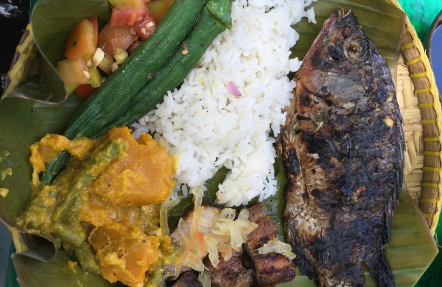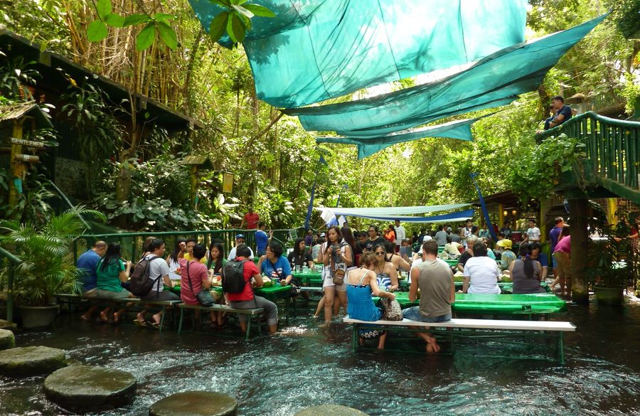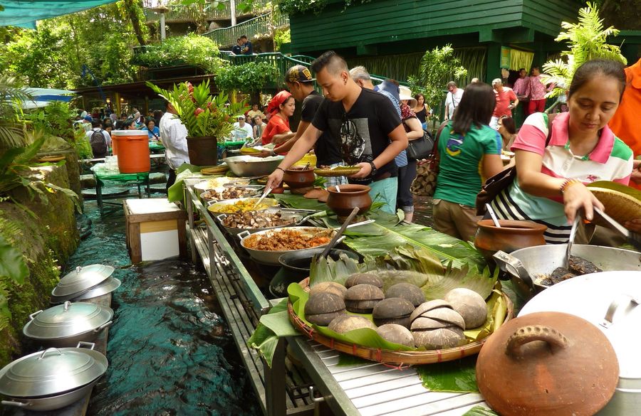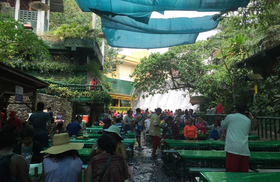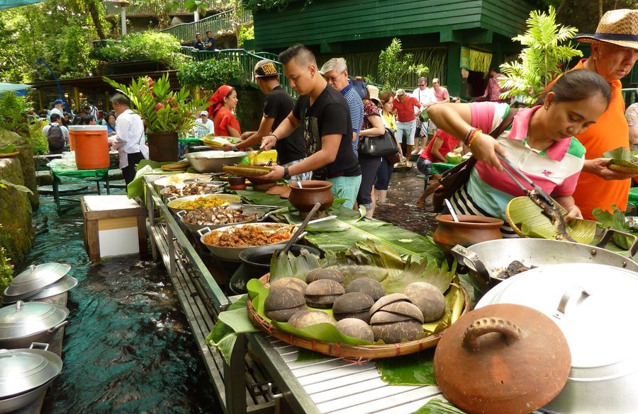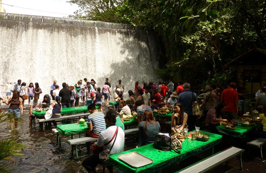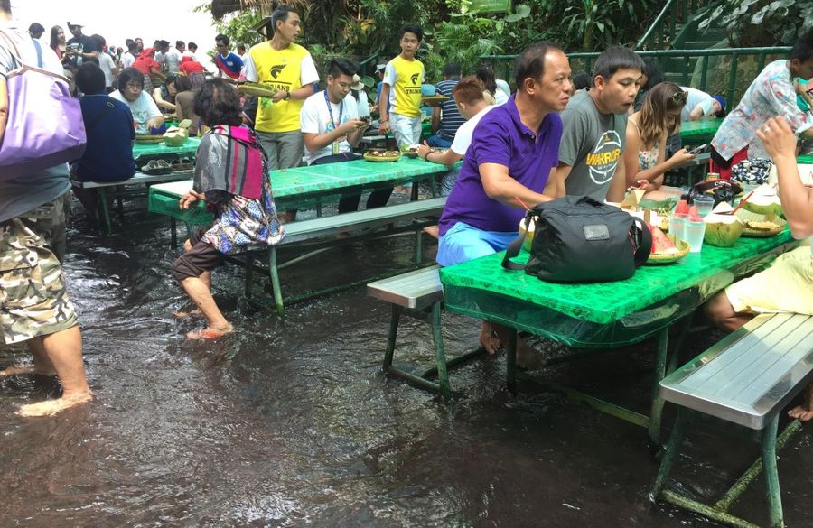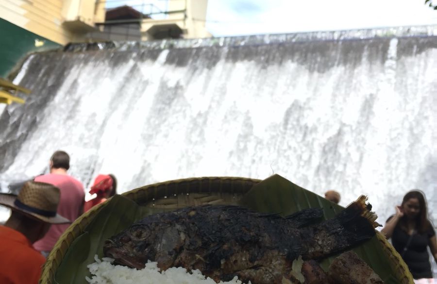 次に訪れるのが最も人気のあるマンメイド滝でのランチです。靴箱に履いてきた靴をしまい、ズボンを膝下までまくって滝へ進んでいきます。水深は足首程度ですのでとても安全です。フィリピンの暑い気候を感じながら、足元はひんやり涼しい水を浴びてフィリピン料理のブッフェランチをお楽しみ下さい。日々の疲れが吹き飛ぶ快感をお楽しみ頂けます。また、運が良ければ日本ではなかなか食べることができないティラピアの塩焼きを試すことができます。白身魚で淡白な味わいはどこか日本の真鯛を思い出します。
