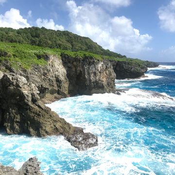 洞窟から出ると、ジャングルをさらに進んで断崖絶壁に出ました。そこから見える海は、深い青でとても美しかったです。その先には世界一深いマリアナ海溝があるそうです。ここで昼食を食べて休憩しました。おにぎりやフルーツがおいしかったです。海風が心地よくて、しばらく景色を眺めていました。