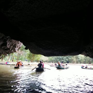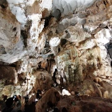 ハノイのホテルからバスで約2時間で現地に着きました。日本語のできる現地ガイドさんの説明を受けながら30人ほどで、近くのお寺と市場の観光を挟み、ハロン湾に向かいます。クルーズ船内ではハロン湾の景色を観ながら美味しいベトナム料理とビールで楽しめます。もちろん、ビール以外のアルコールやソフトドリンクもあります。料理の量がとても多く食べきれないので、相席した方々とシェアします。残しても問題ありませんが、お腹の満足感はあると思います。クルーズの途中で島に降り、鍾乳洞に行きました。洞内には他の観光客も多く、ゆっくりはできなかったのですが、照明をしっかり使っていて綺麗でした。ハノイ観光に来たら、世界遺産であるハロン湾にも行くことが多いと思いますが、このツアーはハロン湾だけでなく、他にも色々楽しめるのでおすすめです。 -