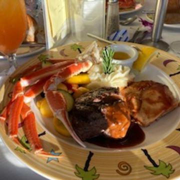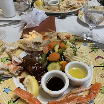 お食事はロブスターやお肉などボリューム満点でとっても美味しかったです。船の上からの夕日はとってもきれいなので、デートにもおすすめです。 -