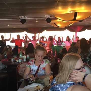 旅行最終日前夜に思い出作りに利用しました。ホテル周辺から船までバスで送迎があったので問題なく行けました。船から見るダイヤモンドヘッドが最高に綺麗で、その時たまたま虹が出ていたのでそれも思い出になりました。船内ではいろんな種類のフラダンスやハワイアンなショーがあっていて、たくさんある席の間でショーをしてくれていたので、目の前で迫力のあるショーを見ることができました。お料理もおいしかったですが、スタッフの方の対応がよかったことの印象が残っています。結構賑やかな雰囲気なので、静かなディナーを好まれる方には向かないかもしれませんが、ハワイアンを感じたい方にはいいと思います。 -