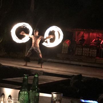 初めてこのフィッシュアイのファイヤーダンスディナーショーに参加しましたが、とても楽しい時間をすごせました。お客さんをステージに招いて踊ったり、目の前で踊ったり飽きずに楽しめました。目玉のファイヤーダンスもすごい迫力で終始盛り上がっていました。公演中に撮影OKなのも嬉しかったです。ただ、席の位置関係でステージのちょうど真ん中の位置に屋根を支える太い支柱が重なってしまい、前から3番目だったのに左側しか主に見られなかったのが残念でした。食事はビュッフェ式で和洋中食いろんなおかずがあり、人種関係なく食事できる感じで味もおいしかったしよかったと思いました。ただ衛生面が少し気になりました。寿司も日本で食べる寿司とそこまで変わらないくらいおいしかったです。デザートもたくさん種類があって大満足でした。あと帰りのバスで、終了後10分15分で出発しますと言われトイレに行くと行列。。写真などあまり撮る余裕なくギリギリ間に合った感じでした。乗車後に人数確認など全くしていなかったので、もし間に合っていなかったら本当に置いていかれてたのかなと思いました。 -