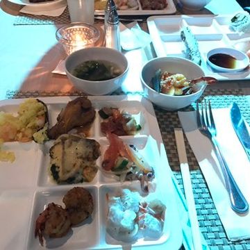 席を案内されてお料理をバイキング。お寿司やステーキ、シーフード料理など美味しくいただきました。1時間バイキング、1時間ショーって感じでバイキング後半にはデザートが並び子どもたちは大喜びでした。迫力はもちろん、笑いもあり、しっとり聴かせてくれる場面もあり、どの年代のかたも楽しめると思いました。 -