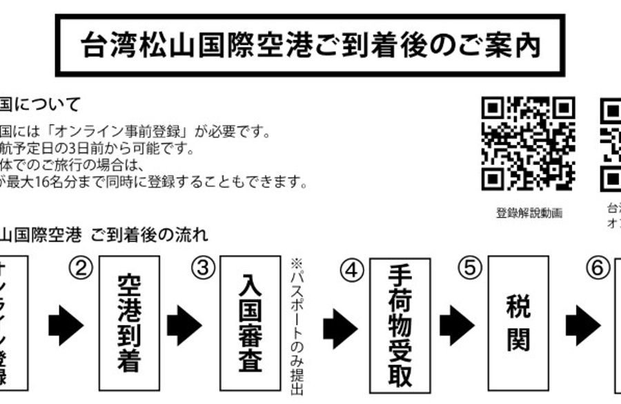 ※台湾では入国時における紙の入国カードを廃止、すべての入国者を対象にオンライン(https://twac.immigration.gov.tw/)での事前申請が必要となります。事前申請は入国日の3日前からの受付となりますので、日本出発前に済ませていただくと台湾での入国がスムーズです。