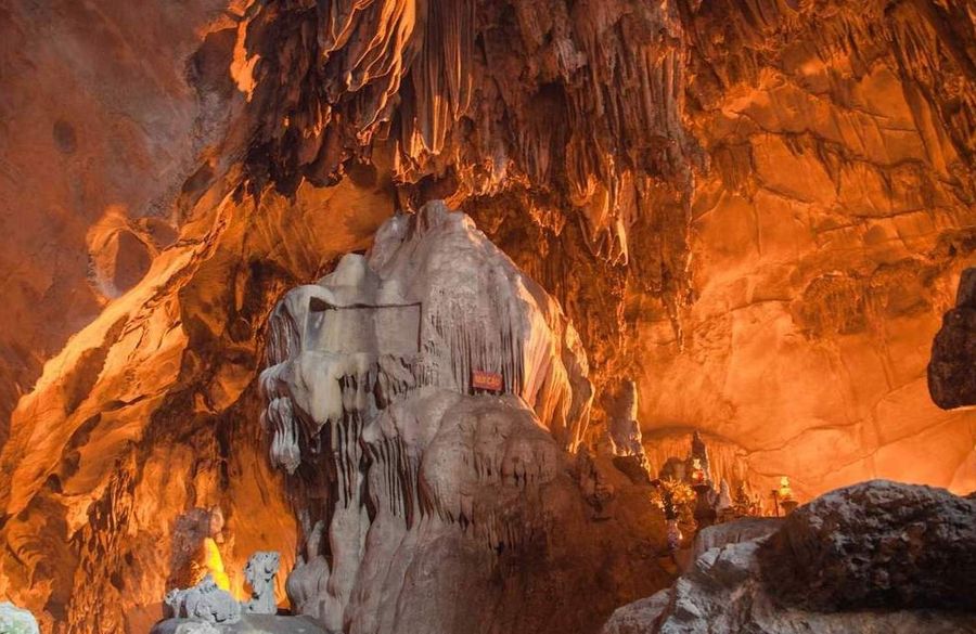 Ride a cable car up to captivating Huong Tich Cave with its stunning stalactites and stalagmites
