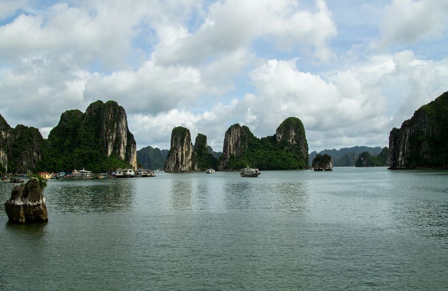 Discover Ha Long Bay, a body of water of approximately 1,500 square kilometers in North Vietnam with 120 kilometers of coastline in the Gulf of Tonkin. Ha Long Bay means "Bay of the Descending Dragon" in the local language. The bay consists of a dense cluster of 3000 monolithic limestone islands, each topped with thick jungle vegetation, which rise spectacularly from the ocean. Several of the islands are hollow and feature enormous caves, while others support floating villages of fishermen, who ply the shallow waters for some of the over 200 species of fish and 450 different kinds of mollusks.