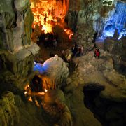 Embark for a dreamy cruise going around the bay with thousands of limestone mountains. Cruising through the emerald water past the Cho Da - Dog Stone and the Dinh Huong Islet (Incense Burner Islet) which consists of only one huge stone in the shape of an incense burner, whose four pins beneath only visible when the tide is low. Afterwards, we will visit the Fighting-Rooster Islets and the Thien Cung Cave (Heaven Palace Cave) to see the beautiful stalagmites and stalactites. within. The way up to Thien Cung Cave is via a winding pathway, surrounded by thick jungle. The cave is a dry cave and houses a complex inner structure with high ceilings.