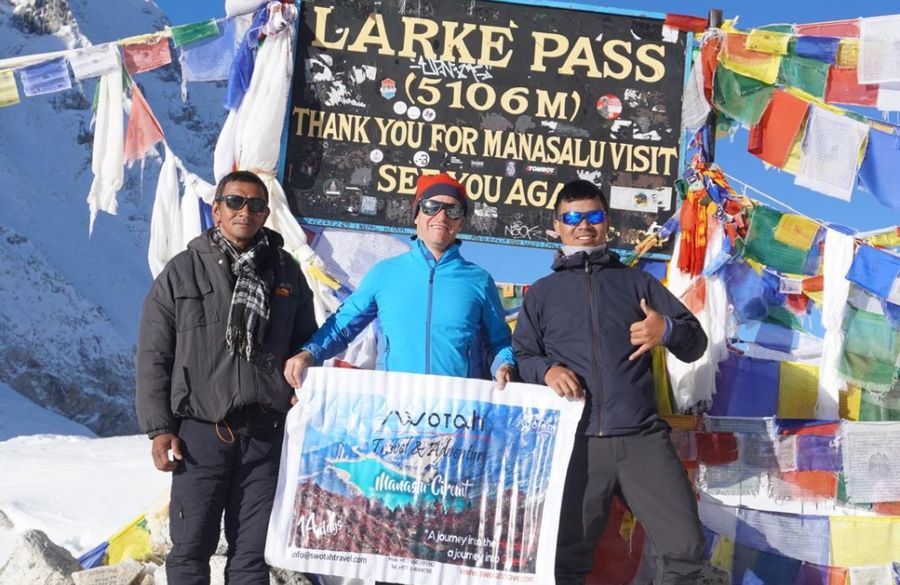 - The highest elevation of the trek, Larkye La Pass, is one of the longest passes; situated at an elevation of 5,106 meters (16,752 feet), it offers mesmerizing panoramic views of the surrounding area, including Snow-capped Mount Manaslu, other notable peaks, glaciers, icefalls, valleys, and particularly a sense of achievement.