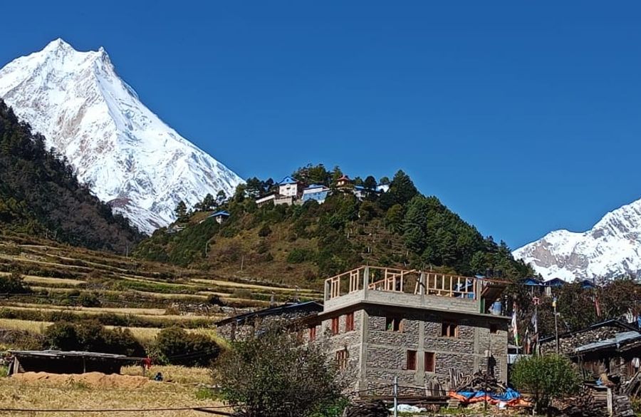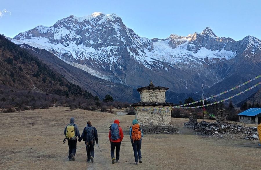 Begin the day with a leisurely morning in Bhimtang, surrounded by majestic peaks like Mt. Manaslu, Himlung Himal, and Punggen Himal. Cross the glacial stream and descend through moraine and pine forests. The trail winds through dense rhododendron woods, especially colorful during spring . Pass by Yak Kharka and scenic pastures used by herders in warmer months . Continue descending to Kharche (2,700m), where you can stop for tea or lunch. Further descent brings you through terraced fields and eventually to the peaceful village of Goa (Gho).
